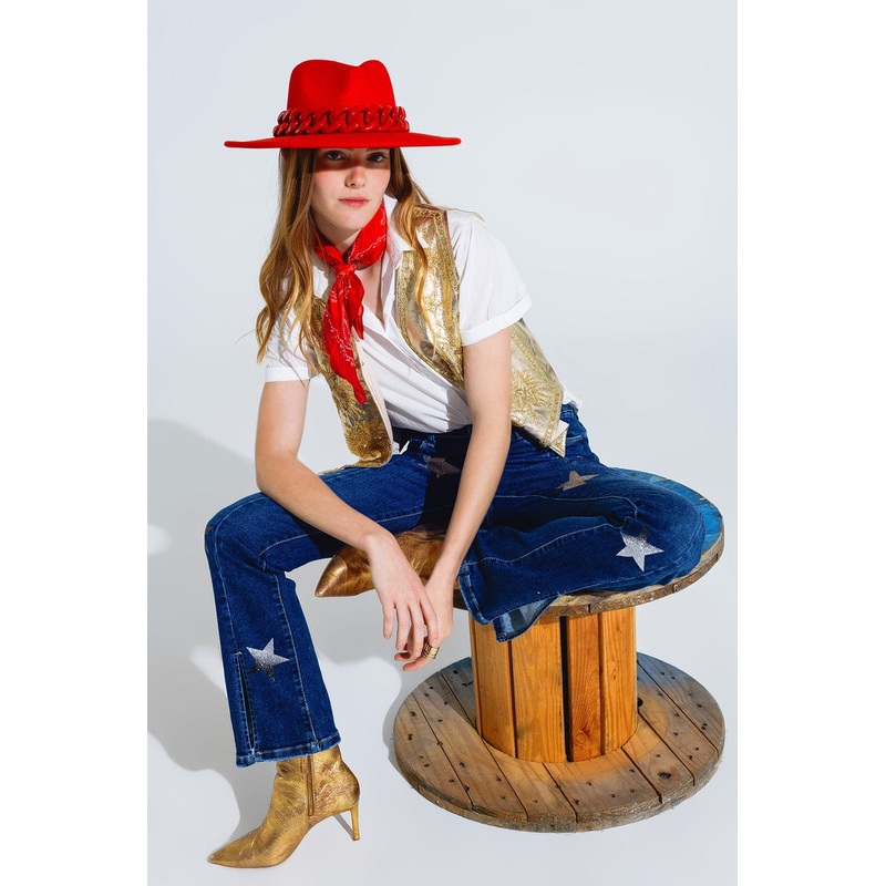 Embrace effortless style and undeniable elegance with our Open Vest with Embroidered Stars in Gold, a must-have addition to your wardrobe for adding a touch of glamour to any outfit.