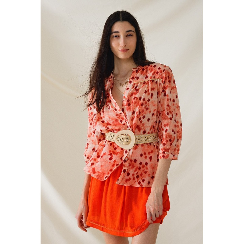 To accentuate your waist and add a personalized touch, consider pairing this shirt with a belt. Whether you’re heading to the office, running errands, or meeting friends for brunch, the Orange Shirt with Abstract Print and 3/4 Length Sleeves promises to elevate your style with its unique design and vibrant color palette.