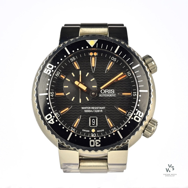 Designed to meet the needs of professional divers this Oris TT1 is a mighty combination of form and function with centre hands for hours and minutes, subsidiary second at 9 h, date window, date corrector, fine timing device and stop-second. Featuring a multi-piece stainless steel case, minutes scale top ring, stainless steel screw-in security crown and Helium valve – it definitely covers all bases! The watch is in superb condition although it is a tool watch and has likely been used for purpose, it is sold with box its original box and papers. Certainly not one for the shrinking violets, this watch is a real meaty piece of kit and with its 47mm diameter, it has a real presence on the wrist whilst remaining surprisingly light and comfortable. The black wave dial is beautifully rich and the zesty orange accents offer a very sporty aesthetic – it isn’t one for slipping subtly under a shirt cuff that is for sure, it wants to be worn and seen!Hands, indices and bezel elements are luminous for improved night time visibility.