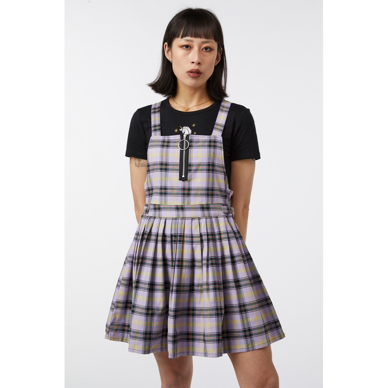 Pleated Skirt Pinafore- Centrefront Zip at bib- Pleated Skirt Style- Metal hardware trims - Made in Cotton Tartan - Slight stretch- Available In LavenderProduct Code: DGFS141330