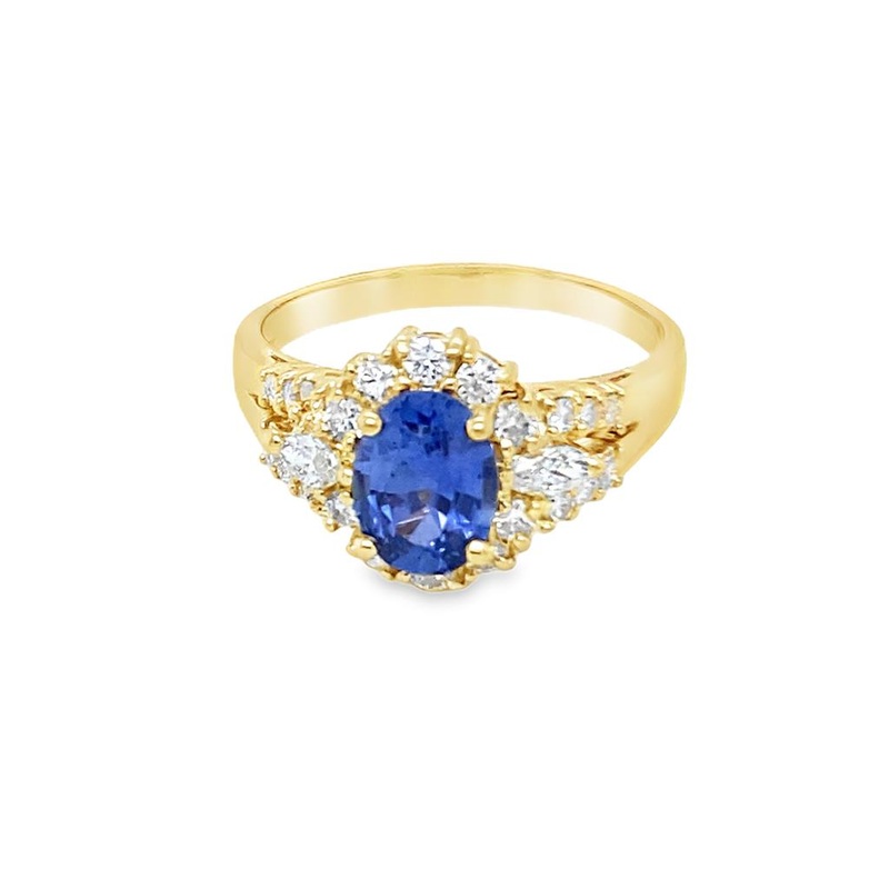 18 Karat Yellow Oval Ceylon Sapphire And Diamond Ring Estate Jewelry Size 8 With One = 1.71Ct Oval Ceylon Sapphire And 24 = 0.53Tw Round H/I Si2/I1 Diamonds Gram Weight: 5.2Jewelry Type: Colored Fashion