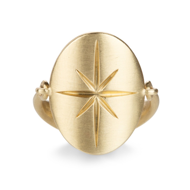 Slip into something luxurious in this 14k yellow gold ring from Nicole Landaw. An oval plate with a stunning carved starburst is linked to a beautifully tapered band. With slight movement to the starburst element, this ring is unique in its form and feel.