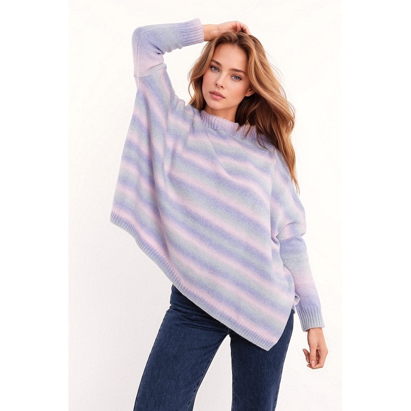 Introducing our Oversized Multicolor Sweater in beautiful shades of pastel purple and blue a cozy and stylish addition to your winter wardrobe. This comfortable sweater features stripes in various hues, creating a visually appealing and vibrant design. Des