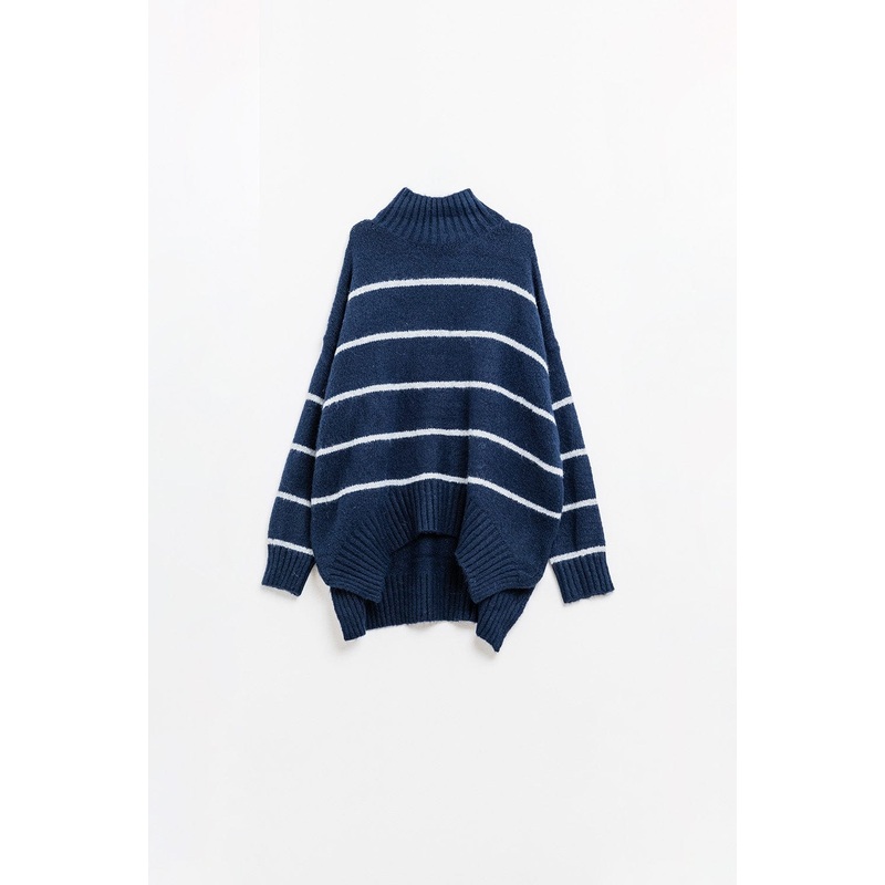 This oversized navy sweater with white stripes is the perfect combination of effortless style and cozy comfort. Designed with a relaxed, oversized fit, it drapes beautifully over your silhouette, creating a laid-back yet polished look. The bold white strip