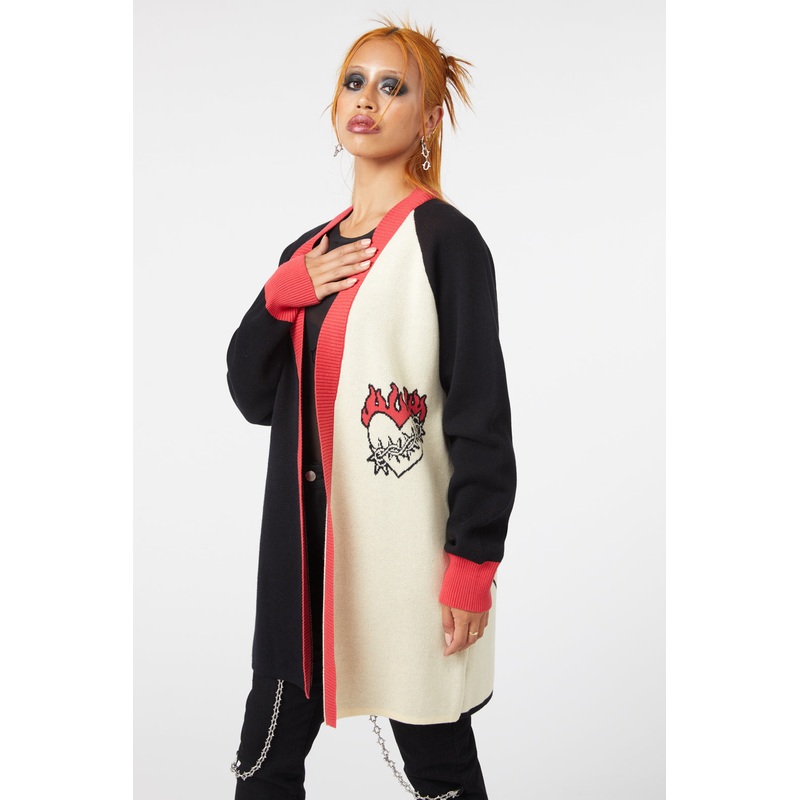 Long Cardigan- Long Sleeves- Thorny Heart Knitted On Front Bust- Thorny Hearts And Roses Knitted On Back- Ribbed Knit Around Neckline And Cuffs- Made From Soft Knitted Cotton- Available In Black/CreamProduct Code: DGFV159403