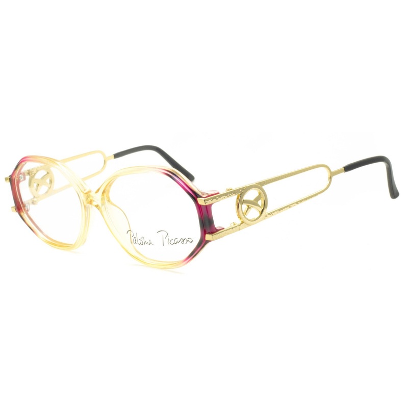 PALOMA PICASSO Full Rim Optyl Vintage Frames - 100% Authentic - 3762 80 Gloss transparent yellow acetate frames with havana cyclamen on sides Polished cutout gold metal arms with gloss black acetate end covers Never been worn Lens Width = 53mm Frame Height