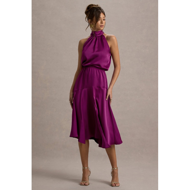 Palonia | Dark Pink Satin High-Neck Split Midi Dress