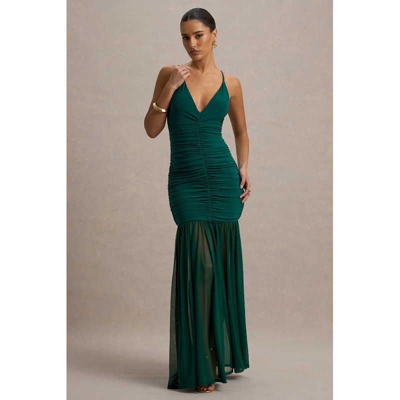 Turns heads this season in our latest maxiPasqualina. Carefully crafted in a gorgeous bottle green hue of our premium jersey, this piece showcases a striking modern silhouette which transforms seamlessly from a plunge neckline to a ruched bodice, finished with a mesh skirt. Perfect for sunset dinner dates, pair yours with dainty details to embrace your femininity.