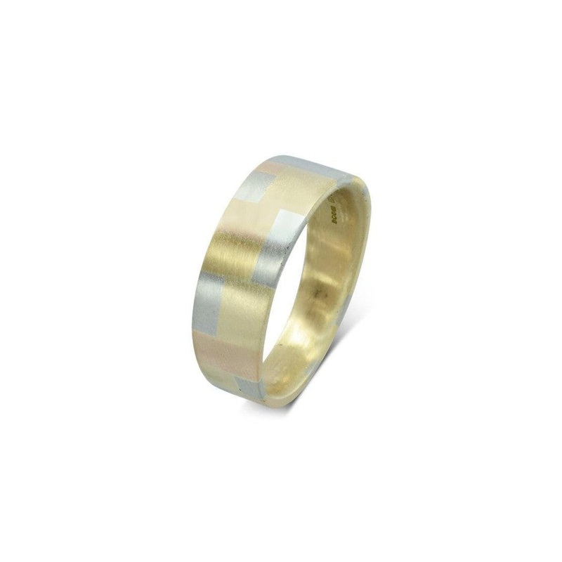 The Patchwork Three Colour Wedding Band is handmade to order from new or sentimental metals.