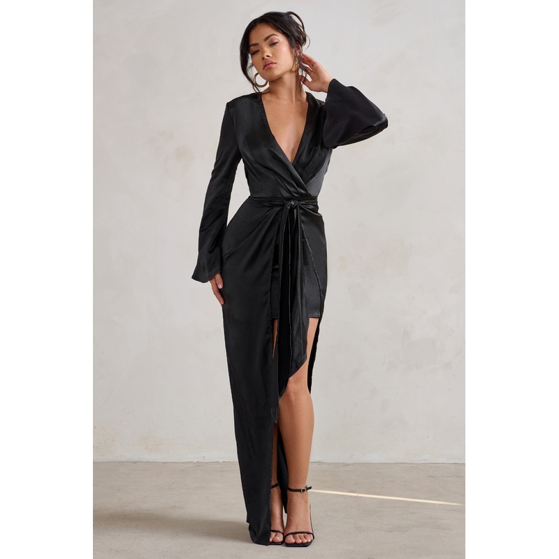 Patricia | Black Extreme Plunge Long Sleeve Maxi Dress With Tie Detail