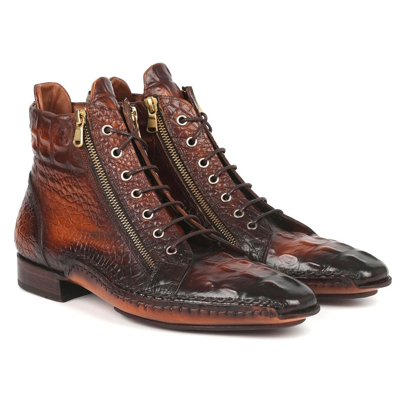 Hand-sewn opanka construction zipper boots for men.Brown burnished crocodiletexturedcalfskin upper.Side and back zippers.Antique burnished double leather sole.The product is a lace-up boot style so the zipper is for decorative purposes only. Laces should b