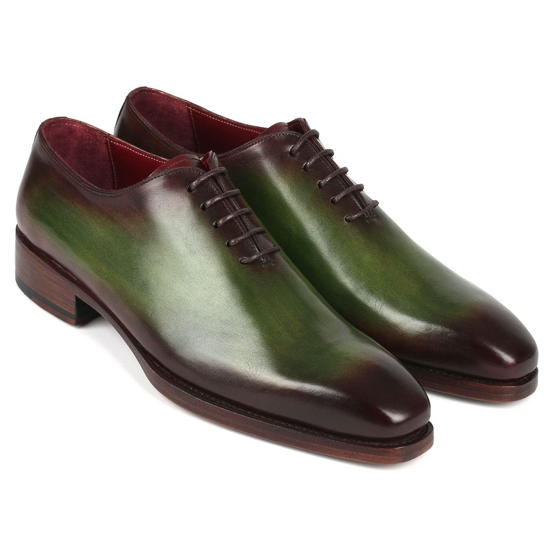 Green & Bordeaux hand-painted leather upper.Goodyear weltedconstruction.Antiqueburnished fiddle-waist double leather sole.Wholecut handmade oxfords for men.Bordeauxleather lining and inner sole.This is a made-to-order product. Please allow 15 days for the