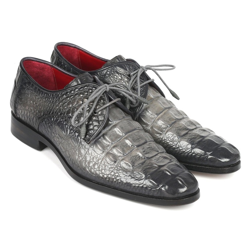 Gray hand-painted men's derby shoes.Crocodile embossed calfskin leather upper.Antique burnished double leather sole.Bordeauxleather lining and inner sole.This is a made-to-order product. Please allow 15 days for the delivery. Because our shoes are hand-pai
