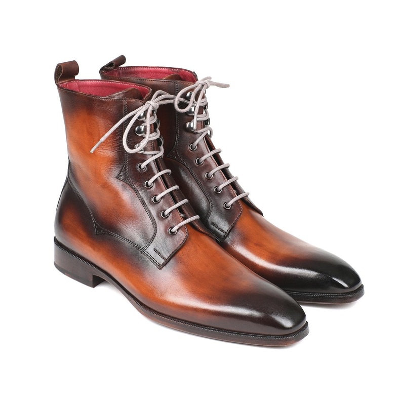 Plain toemen's lace upleather boots.Brown burnished hand-painted calfskin upper.Antiqued burnished leather sole.Bordeaux leather lining and inner sole.This is a made-to-order product. Please allow 15 days for the delivery. Because our shoes are hand-painte