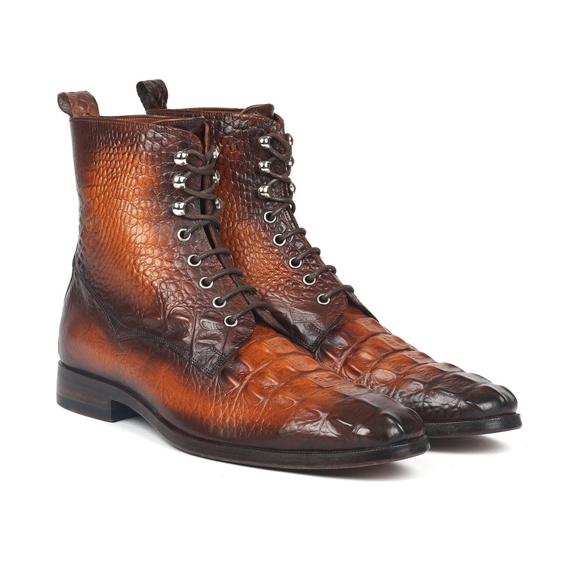 Paul Parkman Men’s Brown Croco Embossed Leather Lace-Up Boots (ID#BT744-BRW)