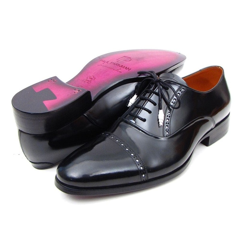 Oxford style captoe dress shoes for menBlack polished leather upper with white perforated decoration.Purple finished leather soleTobacco color leather lining.White leather wrapped lacesThis is a made-to-order product. Please allow 15 days for the delivery.