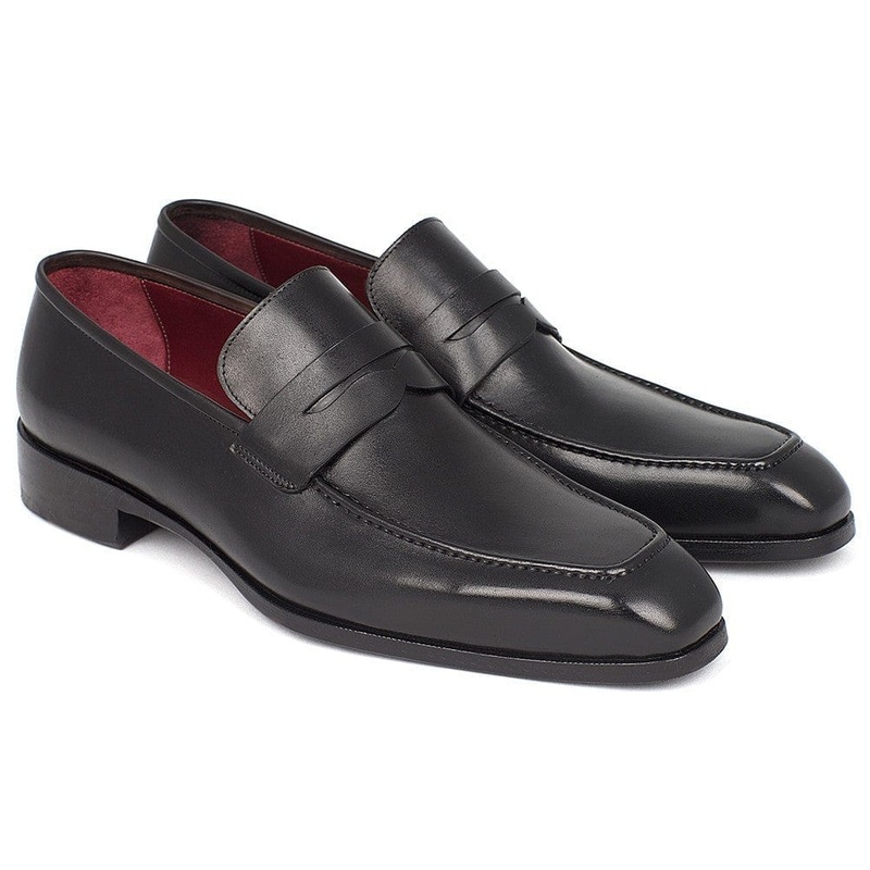 Penny loafer men's slip-on shoesBlack hand painted calfskin leather upperAntique finished leather soleBordeaux leather lining and inner soleThis is a made-to-order product. Please allow 15 days for the delivery. Because our shoes are hand-painted and coutu
