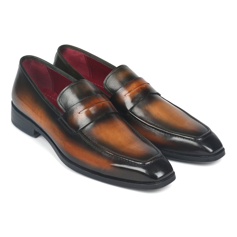 Penny loafer men's slip-on shoes.Olive brown hand painted calfskin leather upper.Antique finished leather sole.Bordeaux leather lining and inner sole.This is a made-to-order product. Please allow 15 days for the delivery. Because our shoes are hand-painted