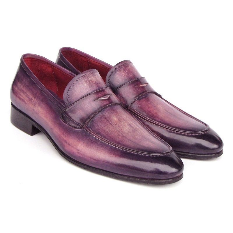 Purple patina hand-paintedleather upper.Bordeaux burnished leather sole.Bordeauxleather lining and inner sole.Men's penny loafer slip-on shoes.This is a made-to-order product. Please allow 15 days for the delivery. Because our shoes are hand-painted and co