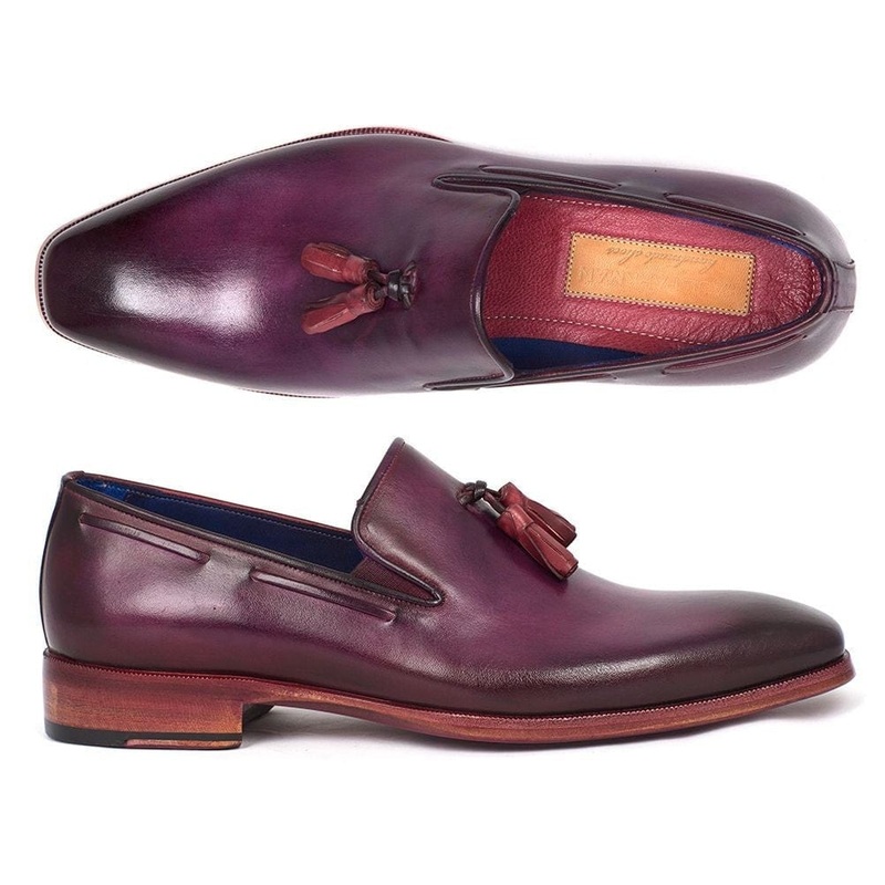 Plain-toe men's tassel loaferPurple hand painted finest Italian calfskin upperPink finished leather soleBlue leather lining and bordeaux inner soleThis is a made-to-order product. Please allow 15 days for the delivery. Because our shoes are hand-painted an