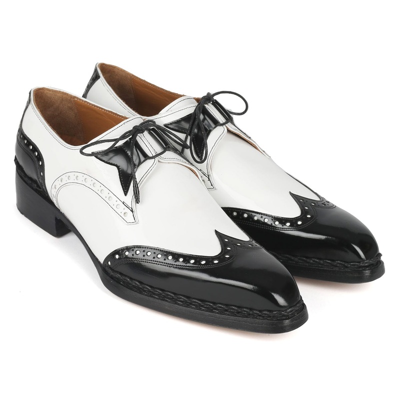 Black polished leather and white patent leather upper.Norwegian hand-welted construction.Fiddle waist handcrafted doubleleather sole.Wingtip derby style dress shoes for men.Natural leather lining and inner sole.This is a made-to-order product. Please allow