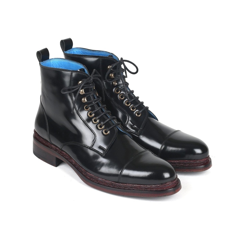 Norwegian hand-welted construction.Polished blackleather upper.Black and purple hand-painted fiddle waist leather sole.Cap toe lace-up boots for men.Blue leather lining and inner sole.This is a made-to-order product. Please allow 15 days for the delivery.