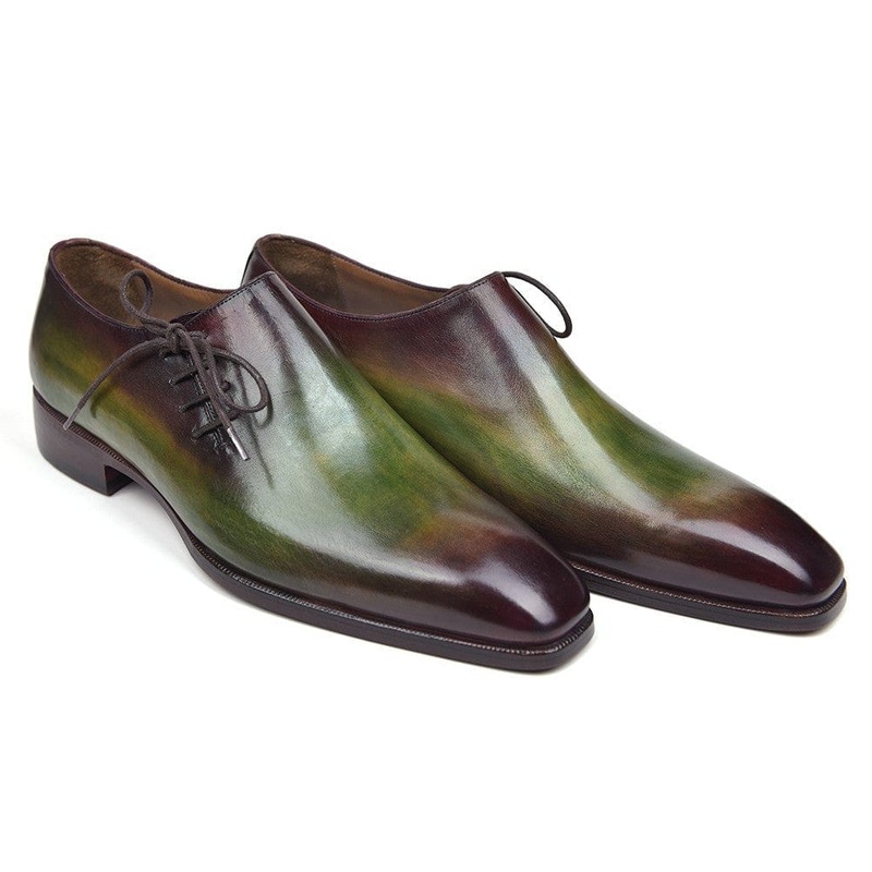 Side lace plain toe oxfords.Green & bordeaux hand-painted leather upper.Purple burnished leather sole.Camel leather lining and inner sole.This is a made-to-order product. Please allow 15 days for the delivery. Because our shoes are hand-painted and couture