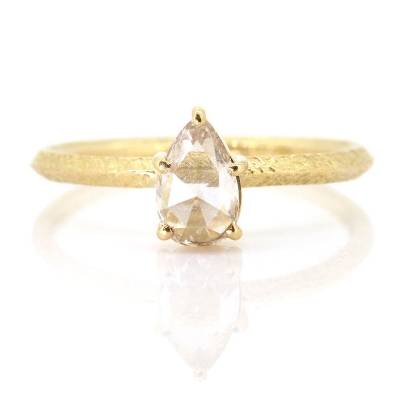 This Pear Rose Cut Diamond Claw Ring is a beautiful rose cut diamond with slight cognac tones. Perfect when stacked with a wedding band or together with another diamond ring.One of a kind and hand crafted in the UK this exquisite piece is made using 18ct F