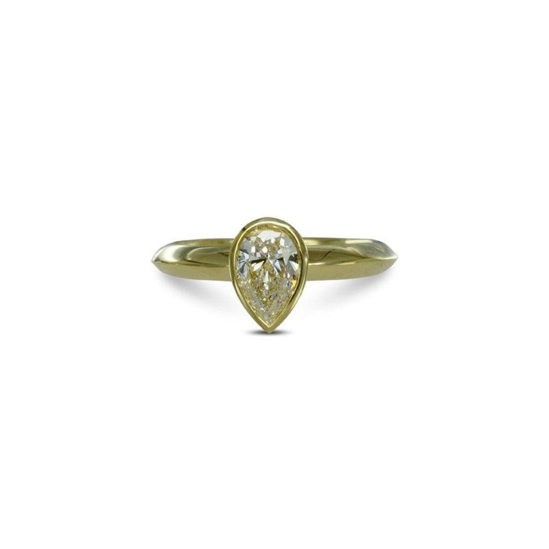The Pear Shaped Yellow Gold Solitaire Engagement Ring blends traditional craftsmanship with contemporary design.Handmade: Each piece is handmade in 18ct yellow gold.Contemporary Design: The Pear Shaped Yellow Gold Solitaire Engagement Ring's modern design