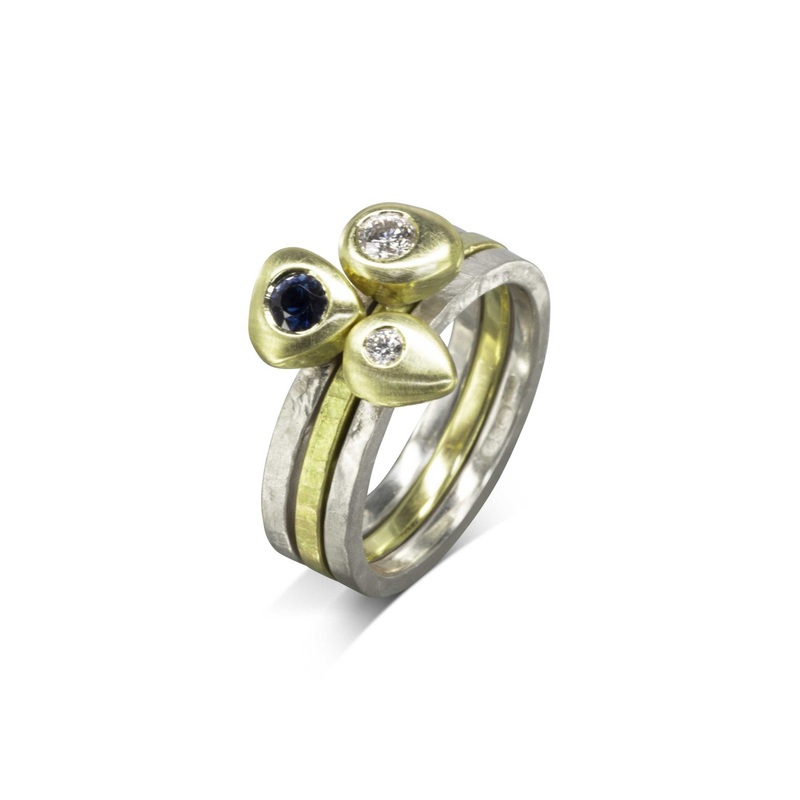 - Set of three pebble stacking rings: One 3mm Black Diamond, 3mm White Diamond and a 2mm diamond on 1.5mm rough hammered square bands, two 9ct white gold and one 9ct yellow or rose gold. All 9ct yellow or rose settings with shapes pictured.