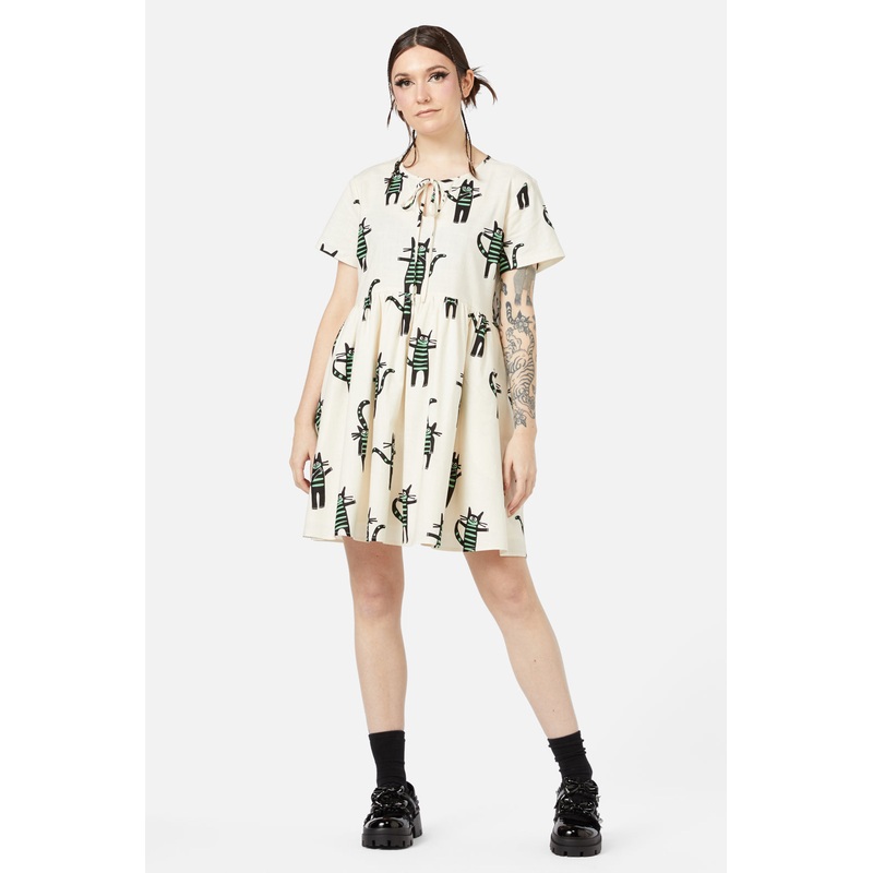 Printed Dress-Features 'Peculiar Puss' Repeat Artwork-Cut In Baby Style-Relaxed Fit-Has Tied Key Hole Cut Out At The Neck-Made From Cotton-Available In CreamProduct Code: DGFY027