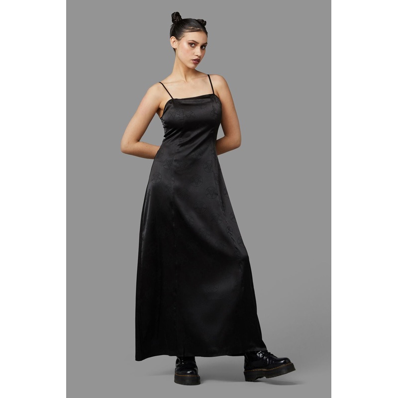 Gothic Gown – Princess Line Dress – Spaghetti Straps – Fitted Shape – Flared Skirt – All-Over ‘pentagram’ Pattern – Fabric Is A Lightweight Satin Brocade – Non-Stretch – Made From Polyester/Elastane – Available In Black