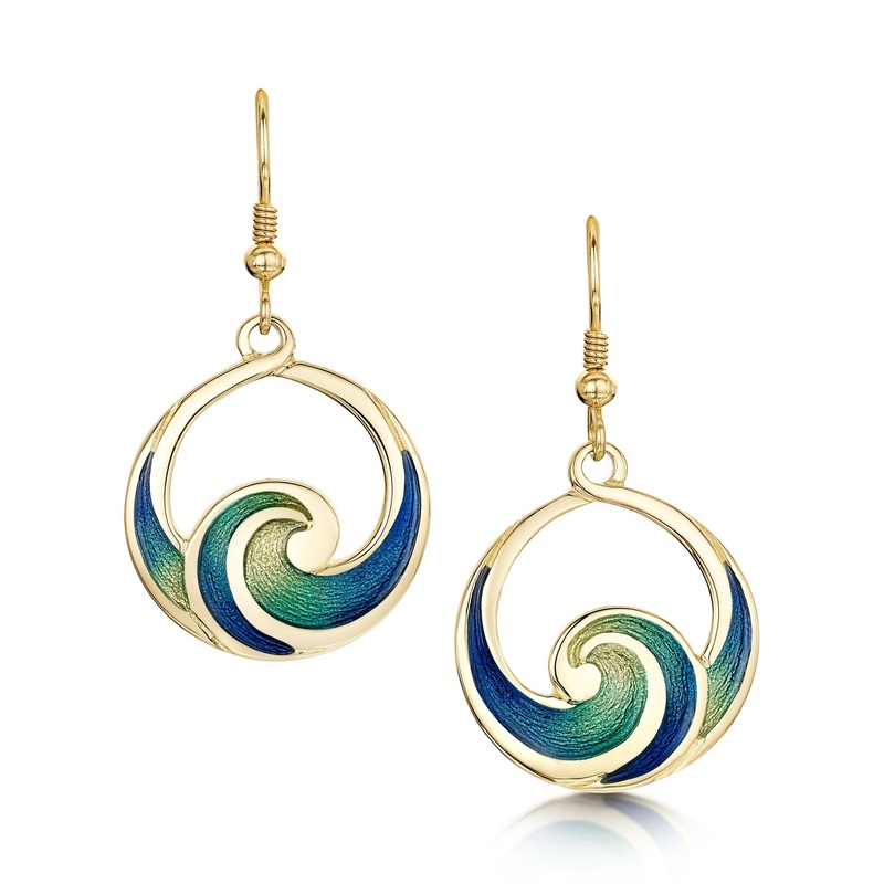 These Pentland drop earrings in luxurious 18ct yellow gold are hand-enamelled in the colour Ocean. The earrings feature a continuous wave design, delicately dropping from gold hooks.Sheila based her Pentland collection on the Pentland Firth, the sea that s