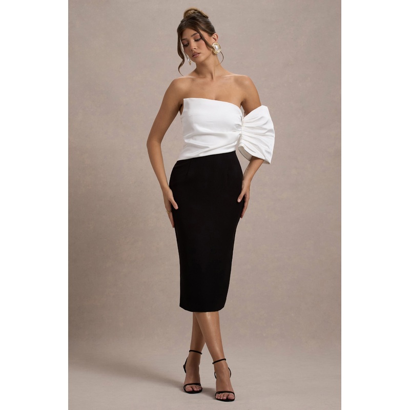 Crafted in a timeless, sophisticated silhouette, Perception is an essential this wedding season. Arriving in a luxurious deep black and white shade of our premium crepe, this midi dress boasts an asymmetric satin neckline, single sleeve and flattering body