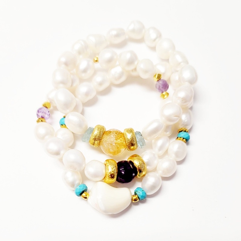 Set of 3 beautiful white pearls bracelets with faceted citrine, amethyst, mother of pearl, turquoise, and gold-plated accents. 7.5 inches and stretch style.