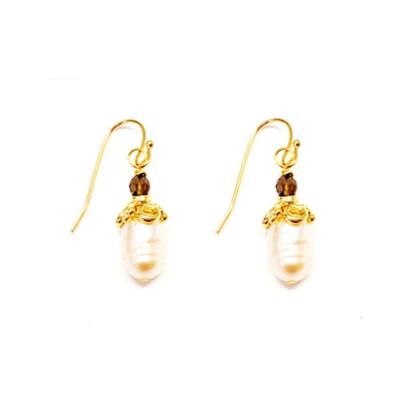 Beautiful smokey quartz and pearl. Gold plated 1", Pierced.