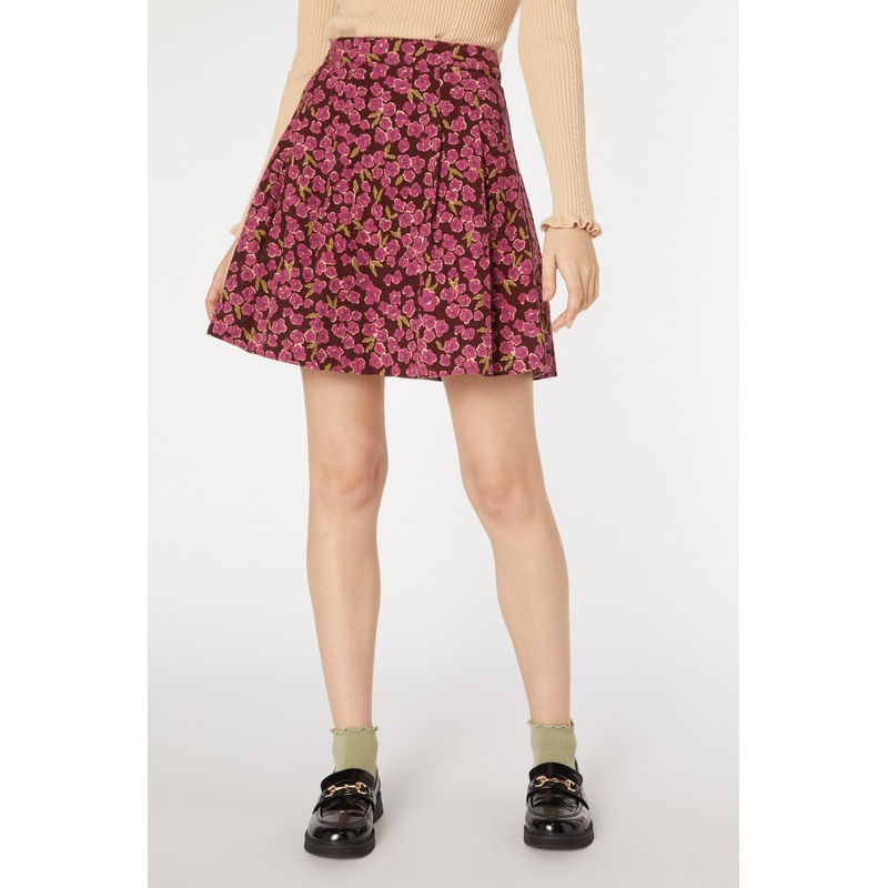 fit to flare floral corduroy skirt- a cosy winter ditsy floral, with a sweet bold vibe- mid weight cotton cord fabric- flared skirt shaping with pleats- length finishes above the knee- back button and hidden zipper closure- available in pink & greenparis w