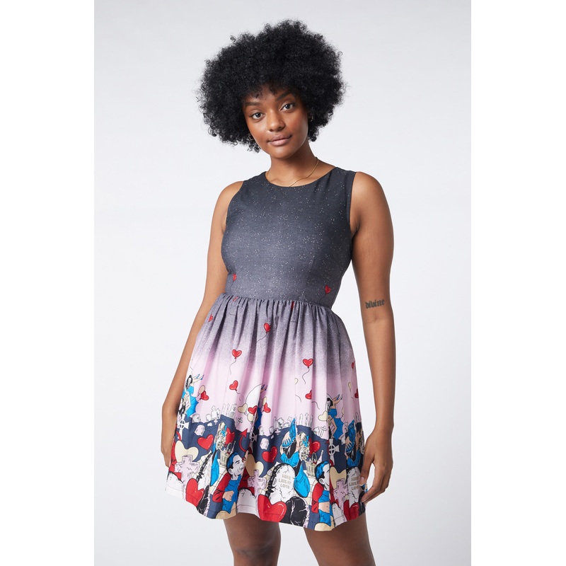 – Fit and flare dress with print – Fitted bodice – Round neckline – Flared shirt with gathers at waist – Zip closure – Pockets – Romantic monster border print – Available in Multi