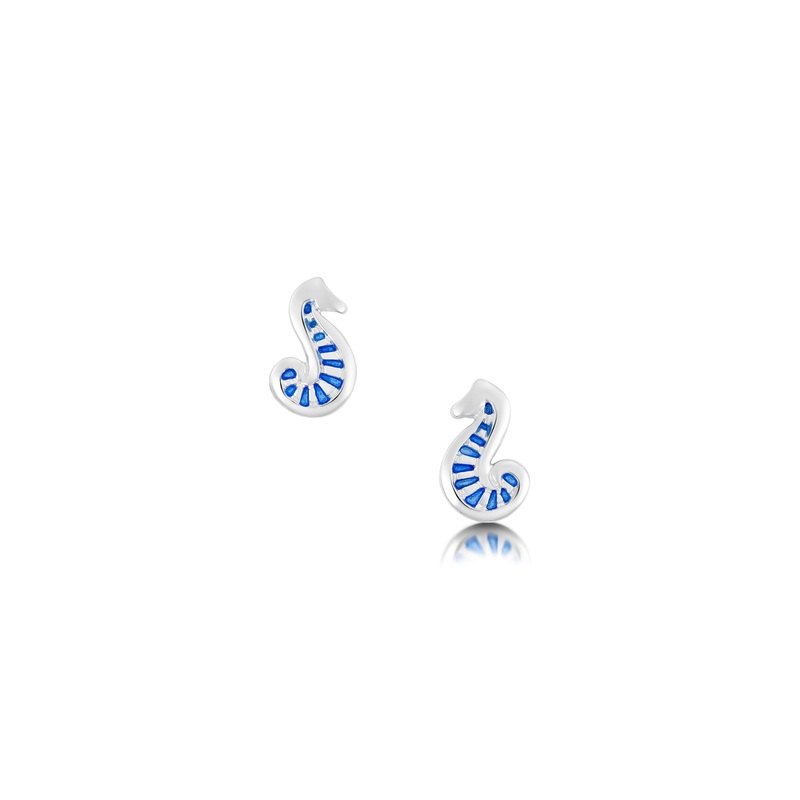 Elegant Pictish Seahorse stud earrings in sterling silver and Electric enamel. Each small seahorse design measures approximately 8mm by 11mm.Sheila took the inspiration for her Pictish Seahorse collection from an ancient symbol stone found buried in a gard