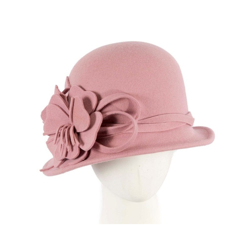 Pink felt cloche hat with short brim and hand-made felt flower. Winter fashion hat Cloche hat Renown Max Alexander brand Fits up to 58cm