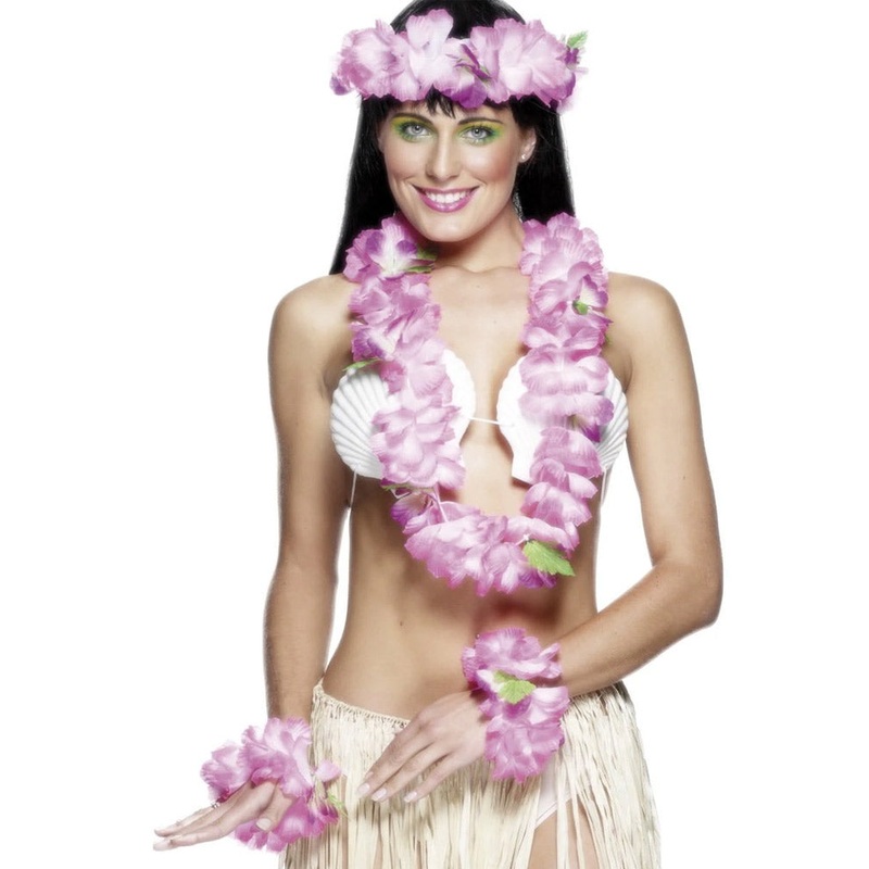 Item Includes:Lei.Headband.2x Wrist bands.Please note: Shell bra and skirt not included.Island paradise.Transport yourself to a tropical island with this Pink Hawaiian Lei Headband and Wristbands Set. Included in the set is a headband, lei and two wrist ba