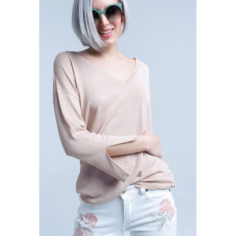 Pink 3/4 sleeves sweater. V-neck and bow closure in the back. Shiny lurex fabric. 70% Viscose 15% Polyamide 10% Polyester 5% Metal