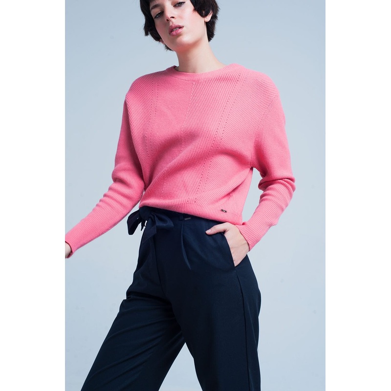 Pink Textured Sweater with Round Neck. Chunky sweaters are so cozy and perfect for keeping you warm and chic as the temperatures start to drop. This sweater boasts of eye-catching texture created by the knit, adding interest to its monochromatic pink color