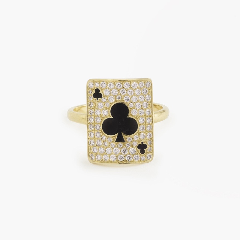 ThePinkie Harmonie Ringis made in France from 18 carat yellow gold, featuring black lacquer and white laboratory-grown diamonds to make up the playing card design.Part of MYSTERYJOY'sGame Illusion Collection, which isinspired by mystery and chance, with je