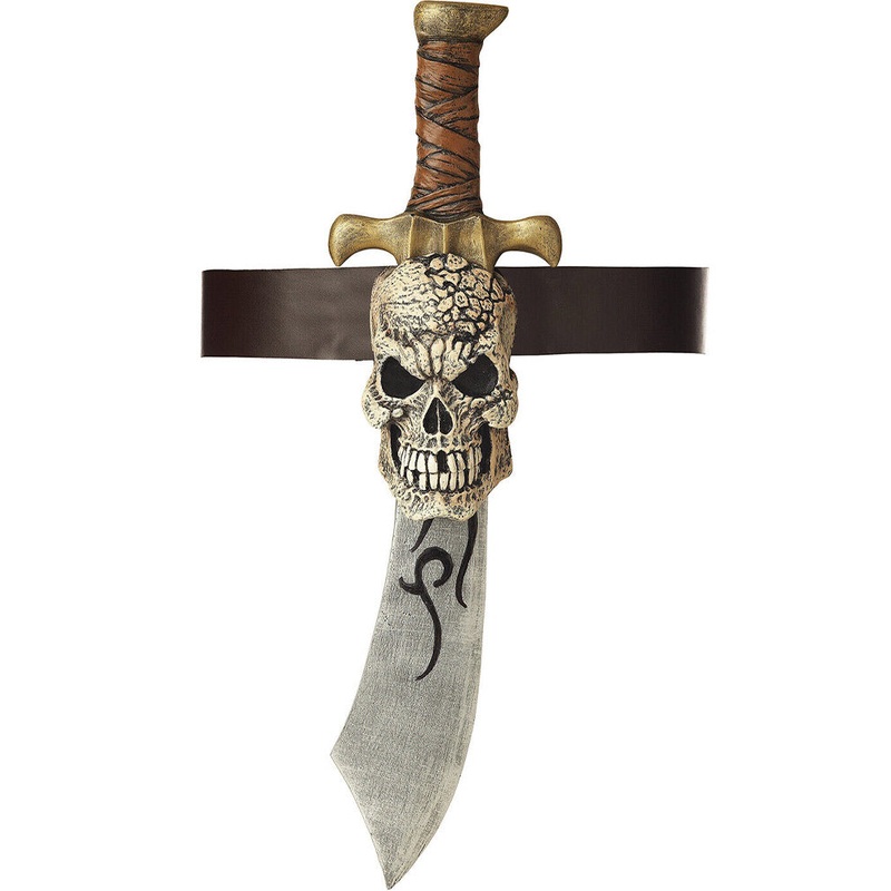 Settle your arguments the pirate way with this Pirate Sword with Skull Sheath 61cm. This great pirate sword is fit for any pirate, from Blackbeard to Davy Jones. This pirate sword has a leather-look belt that secures in place with velcro around your waist. The sword handle comes in a rustic gold design with a brown wrapped leather-look middle, a silver blade with a smiling skull attached to the front of the sword and black curved designs coming out underneath it. The perfect accessory for your pirate costume.