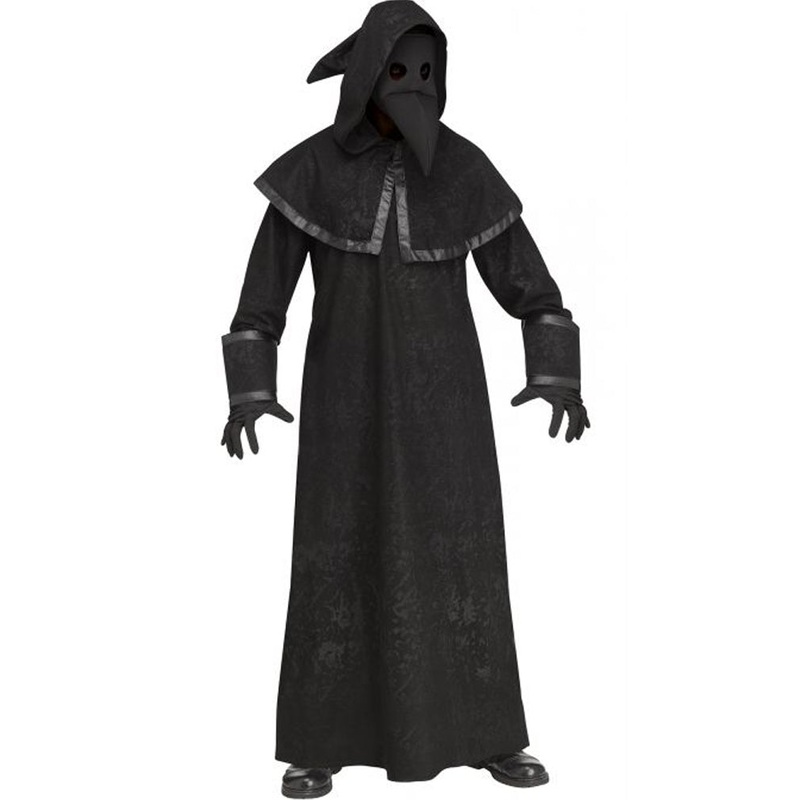 Eradicate the plague in creepy style this Halloween with this Plague Doctor Mens Costume. The costume comes with a long black robe with wrist cuffs featuring a pleather trim, as well as a matching hood with a pointed hood tip and an attached capelet with matching black pleather trim. To complete the costume, a pair of black gloves and a black fabric mask that covers the face and features two circle eye holes and a pointed beak is included. Get ready for Halloween!