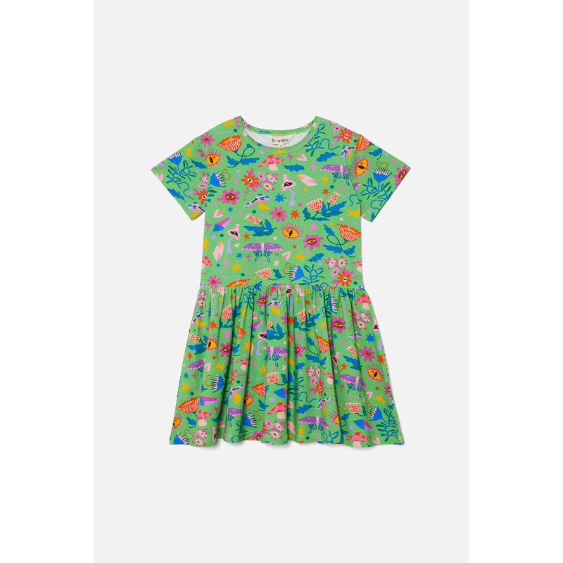 printed cotton relaxed fit dress - cotton elastane stretchy fabrication- short sleeve length- finishes at knee length - soft gathers at waist seam- short sleeve length - rounded neckline- features exclusive kids print Product Code: DKGW014