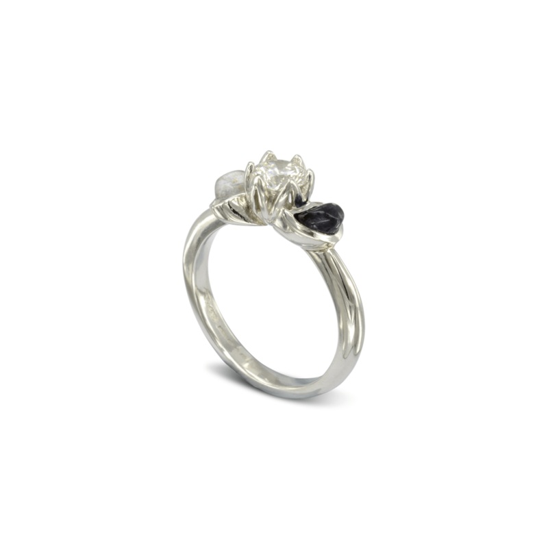 The Platinum Yin-Yang Engagement Ring features specially cut Onyx and White Agate teardrop shapes forming the shoulders of the ring, creating a distinctive and symbolic design reminiscent of the Chinese Yin-Yang symbol.