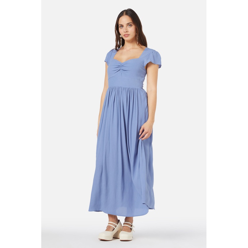 Blue romantic midi dress, a flattering style with a sweetheart neckline, cut out back detail & gathered skirt - sweetheart neckline- paneled bodice shape - short & floaty cap sleeves - fitted at waist with a gathered skirt - back tie detail with shirred ba