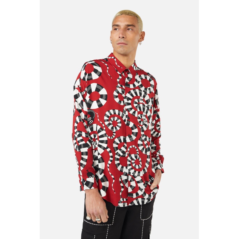 Graphic Shirt- Features 'Poisonous' Repeat Artwork-Has Button Front-Long Shirt Sleeves-Shaped Collar-Made From Viscose-Available In RedProduct Code: BBFY014